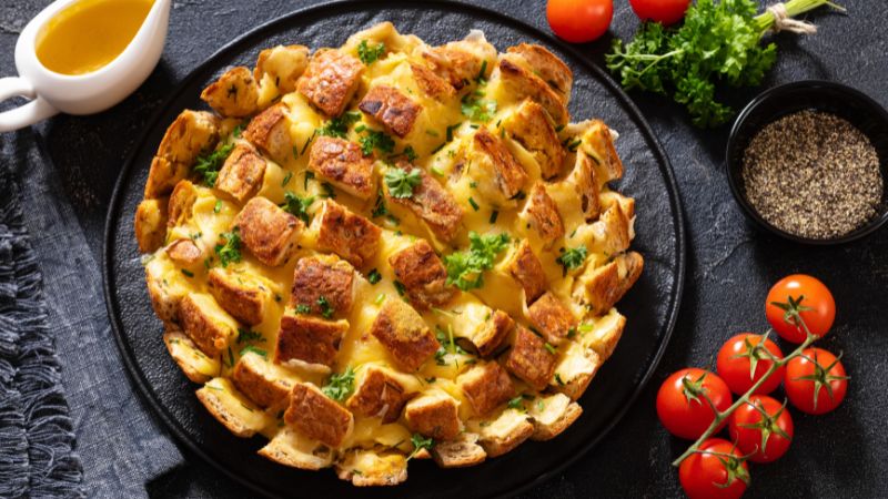 This warm, cheesy, herbaceous bread can sure become the centerpiece of your appetizer spread– the diamond-cut pattern reveals pockets of gooey Brie and jewel-like cranberries, making it not just delicious but also visually impressive.