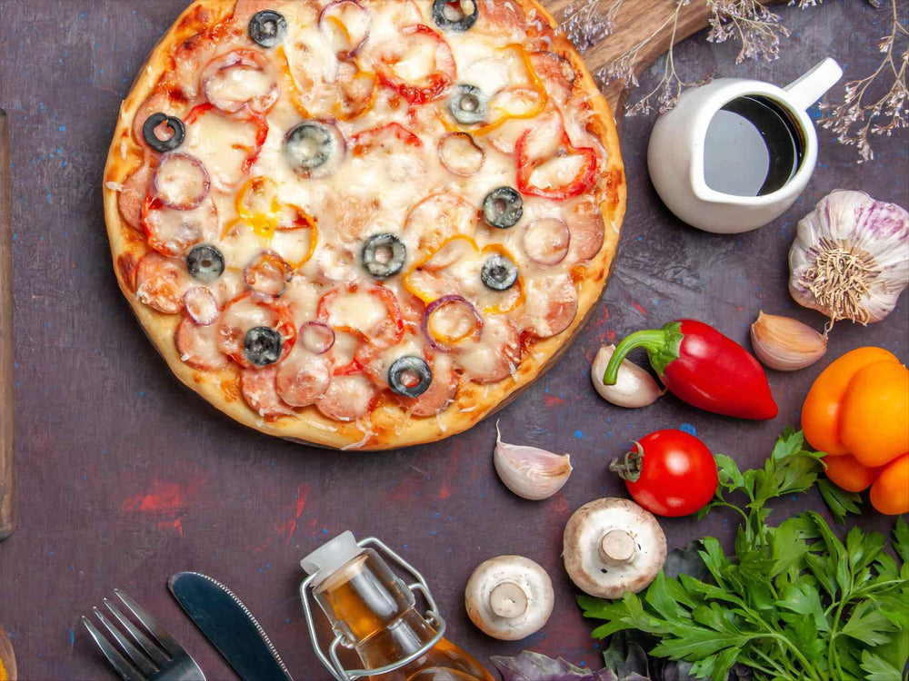 The mushrooms on top of this pizza have been cooked in a white wine reduction, giving them a snappy sweet and acidic flavor.