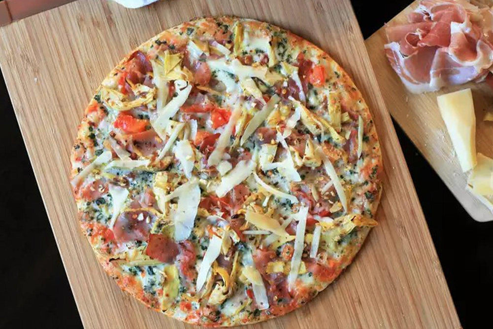 Salty prosciutto and briny artichoke hearts are baked atop a flavorful, premade frozen Margherita pizza for a tasty alternative to traditional higher-carb pizzas. Cut into small 2-inch squares for the perfect appetizer.