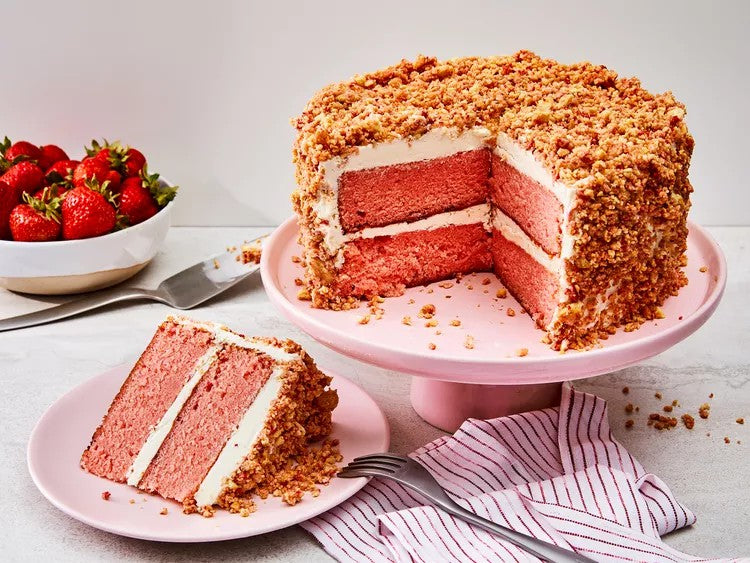 This strawberry crunch cake has 2 layers of strawberry-flavored cake, vanilla buttercream frosting, and a delicious strawberry and golden cookie crumble coating. Perfect for a show-stopping dessert, or for anyone who loves strawberry crunch ice cream bars!
