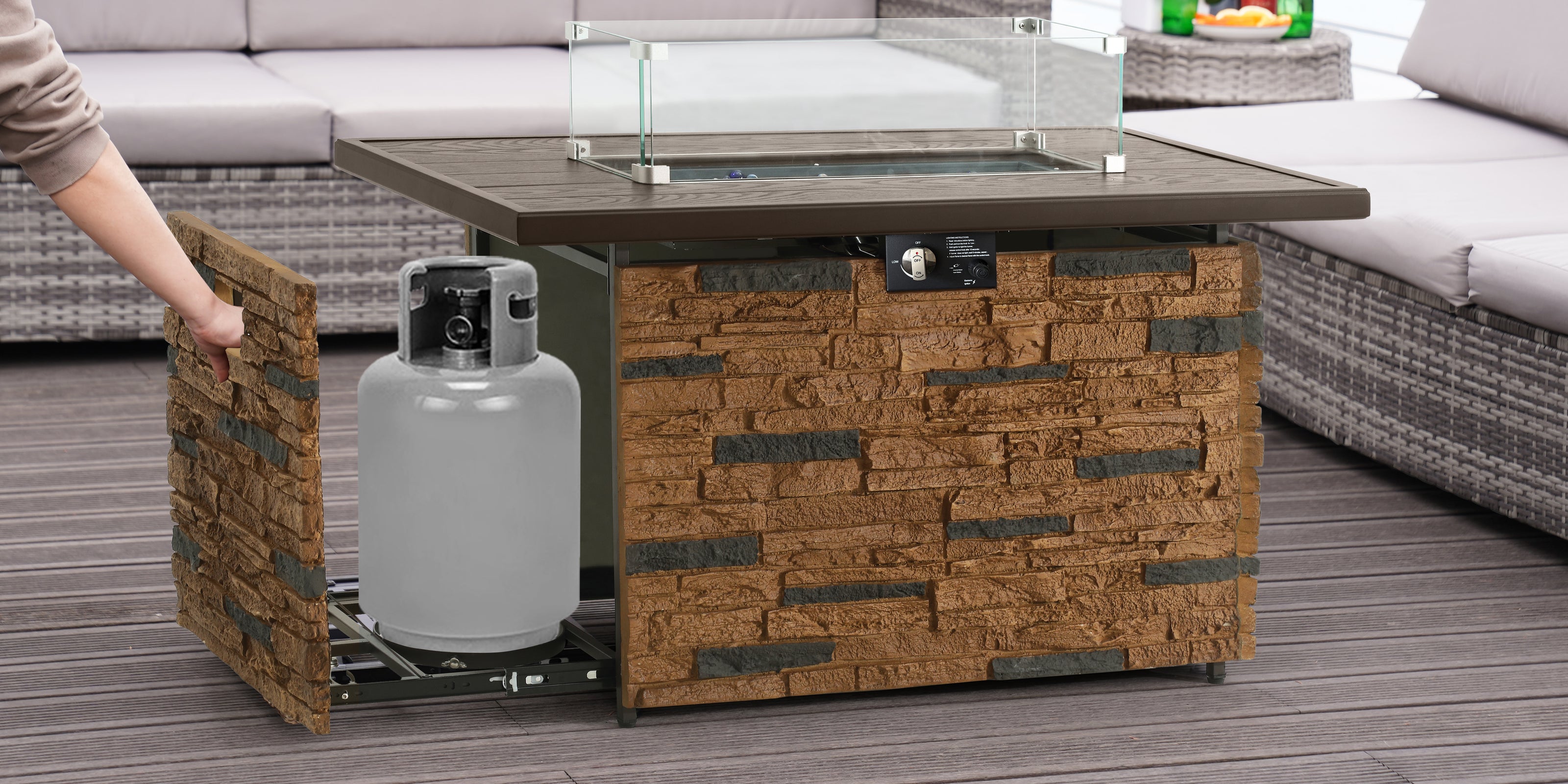 Change and conceal your propane tank quickly with a sliding rail. The table can be used with a 20 lb propane tank that is stored underneath the fire table (*propane tank not included*).