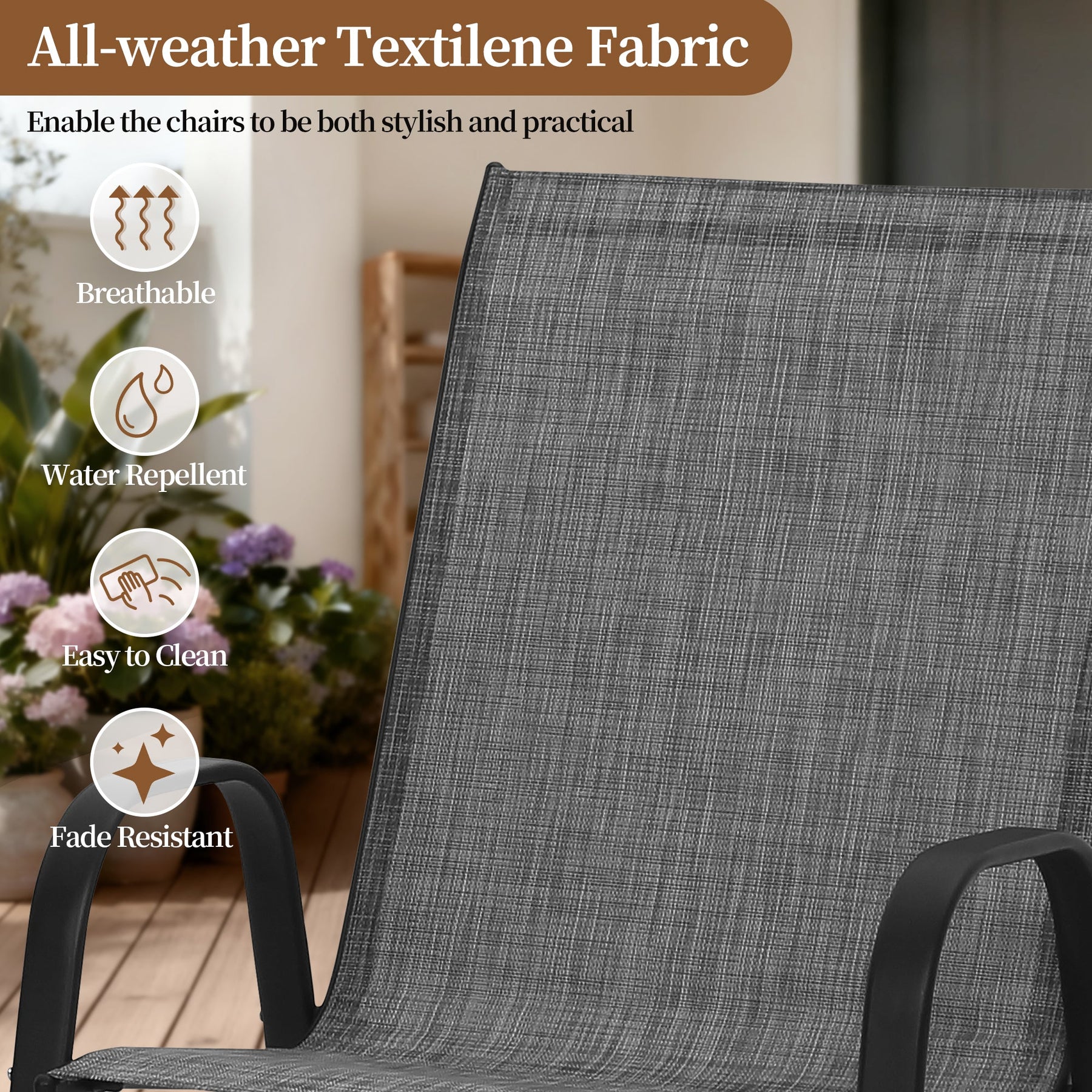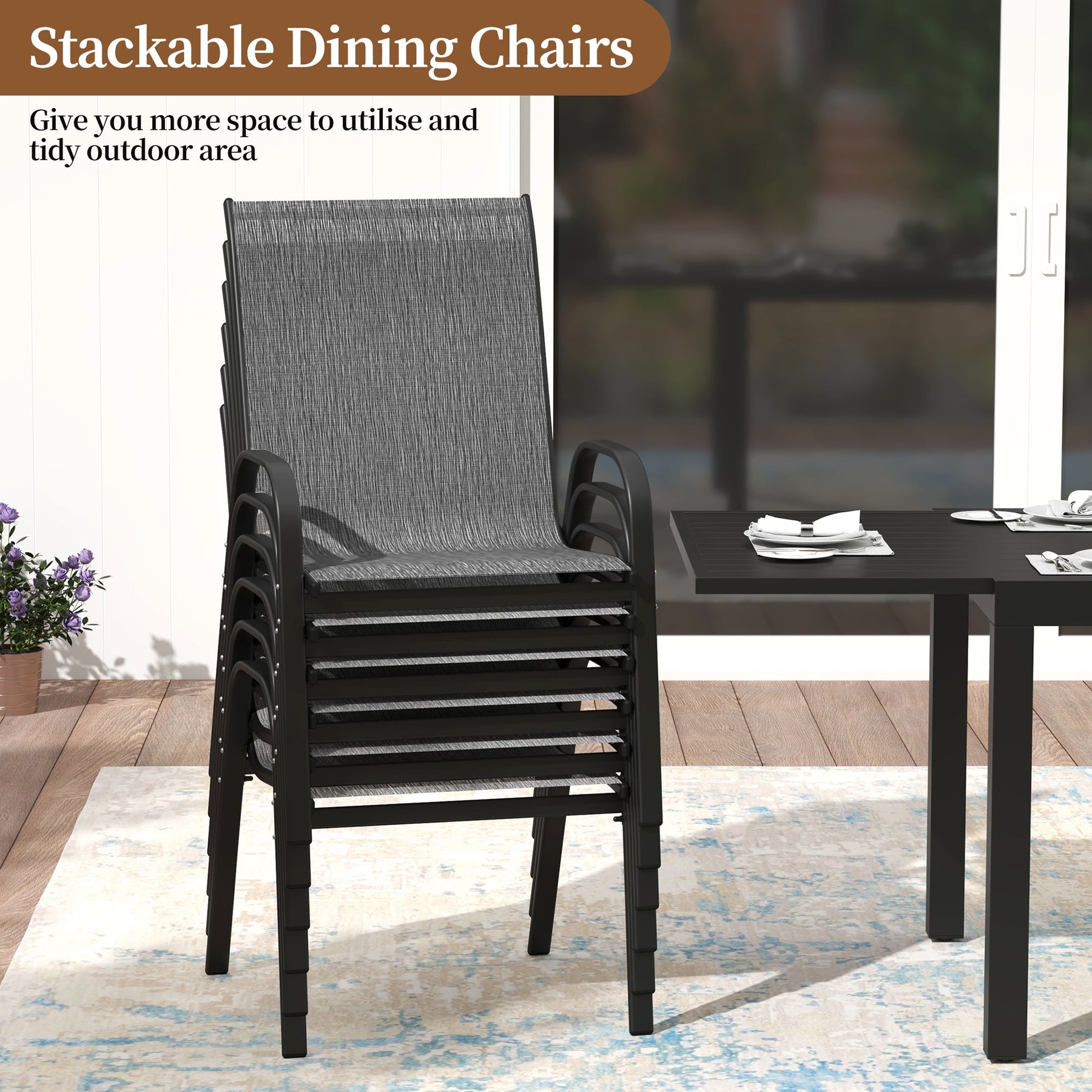 The patio chairs can be stacked together for space-saving storage.