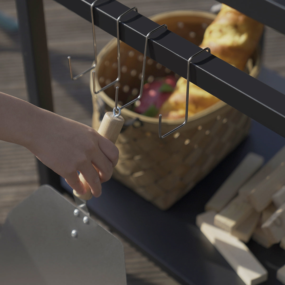 Double-shelf dining cart with plenty of hooks. Keep all your cooking utensils within arm's length when you are cooking. Set all your ingredients on the foldable side table ready to go. The bottom shelf can be used to store a propane gas tank or for logs.